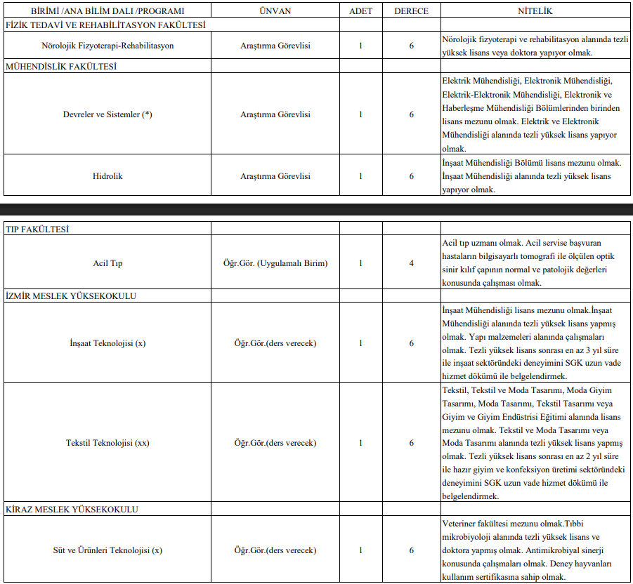Dokuz Eylül Üniversitesi bünyesinde açılan kadrolar farklı fakültelere ve meslek yüksekokullarına dağıtıldı. İşte dikkat çeken bazı pozisyonlar: