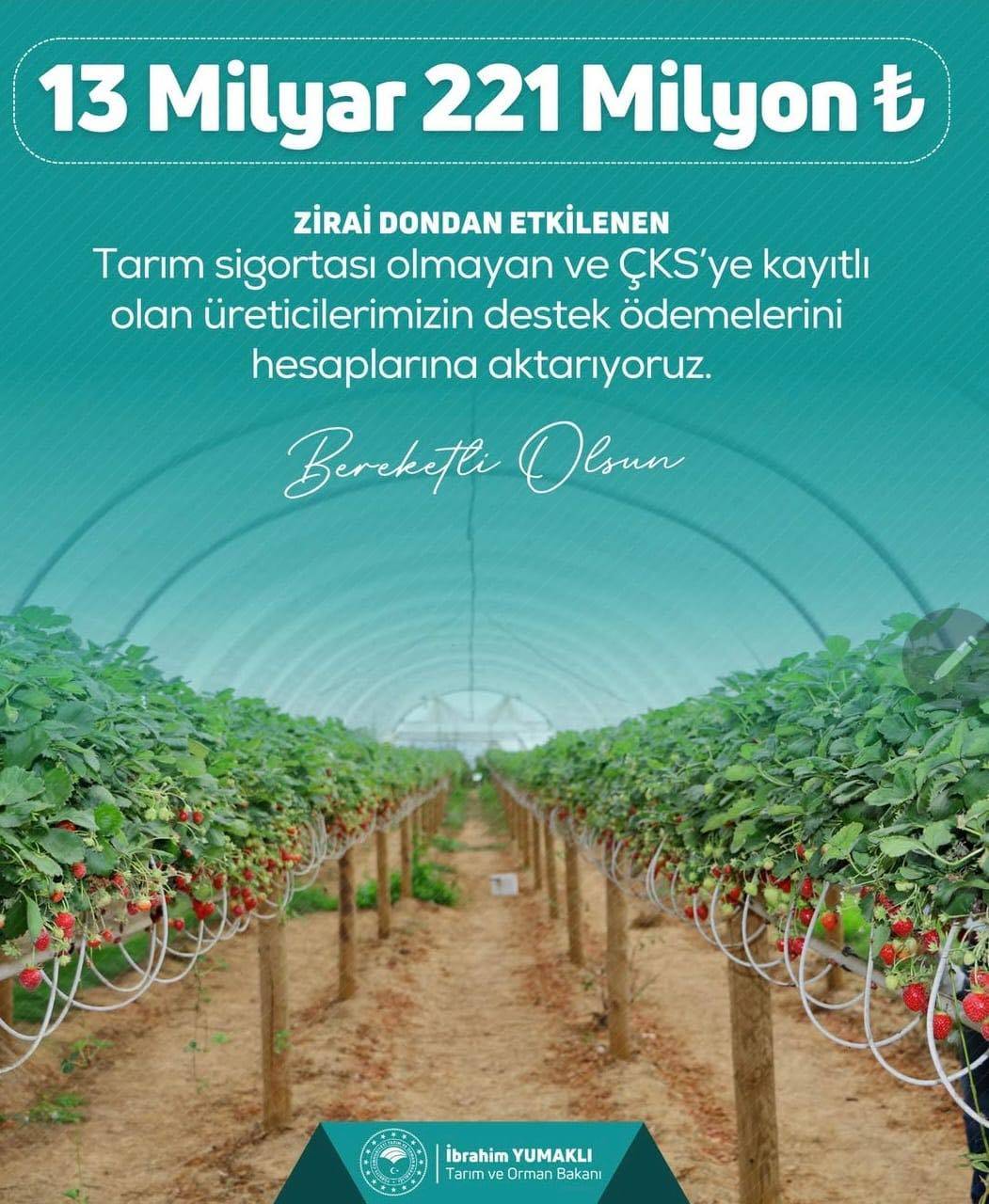 “Zirai don olayından etkilenen üreticilerimizin mağduriyetini gidermek için çalışmalarımızı titizlikle sürdürdük. Devletimizin güçlü desteğiyle çiftçilerimizin üretim gücünü korumayı hedefliyoruz. Bu destek ödemeleriyle birlikte üreticilerimizin yeni sezona umutla girmelerini temenni ediyoruz.”