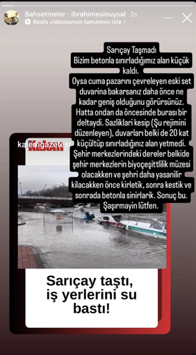 "Sarıçay taşmadı, bizim betonla sınırladığımız alan küçük kaldı. Oysa Cuma Pazarını çevreleyen eski set duvarına bakarsanız daha önce ne kadar geniş olduğunu görürsünüz. Hatta ondan da öncesinde burası bir deltaydı. Sazlıkları kesip (su rejimini düzenleyen), duvarları belki de 20 kat küçültüp sınırladığınız alan yetmedi. Şehir merkezlerindeki dereler belkide şehir merkezlerin biyoçeşitlilik müzesi olacakken ve şehri daha da yaşanılır kılacakken önce kirlettik, sonra kestik ve sonrada betonla sınırladık."