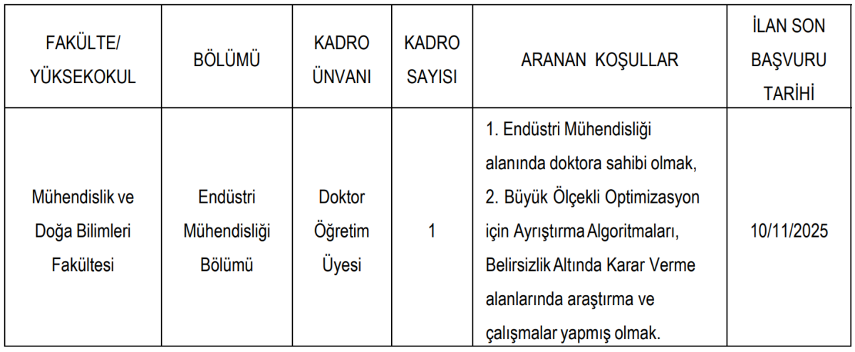 Kadir Has Üniversitesi Rektörlüğü, Mühendislik ve Doğa Bilimleri Fakültesi, Endüstri Mühendisliği Bölümü’nde görevlendirilmek üzere doktor öğretim üyesi alım ilanını yayımladı. Tam zamanlı olarak açılan bu kadro, 2547 sayılı Yükseköğretim Kanunu ve “Öğretim Üyeliğine Yükseltilme ve Atanma Yönetmeliği” hükümlerine uygun şekilde yürütülecek. Ayrıca adayların KHAS Akademik Personel İstihdam Yönergesi’nde belirtilen kriterleri de sağlaması gerekiyor.