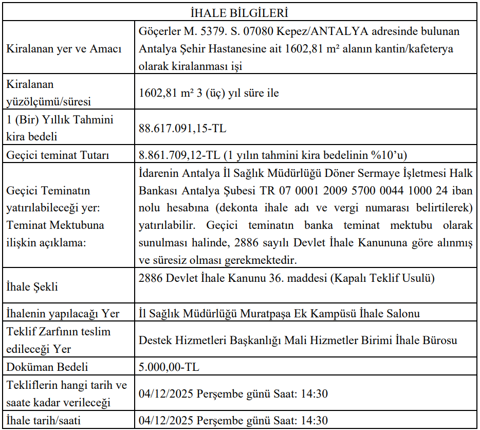 Antalya İl Sağlık Müdürlüğü, Kepez ilçesinde bulunan Antalya Şehir Hastanesi yerleşkesindeki 1602,81 metrekarelik kantin/kafeterya alanını 3 yıllığına kiraya çıkarıyor. 2886 Sayılı Devlet İhale Kanunu’nun 36’ncı maddesine göre Kapalı Teklif Usulü ile gerçekleştirilecek ihale, 4 Aralık 2025 Perşembe günü saat 14.30’da Muratpaşa Ek Kampüs İhale Salonunda yapılacak.