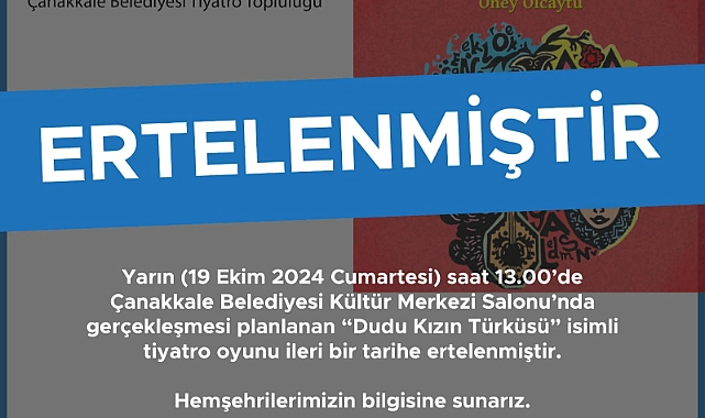 Çanakkale Belediyesi konuyla ilgili yapmış olduğu paylaşımda, ""19 Ekim 2024 Cumartesi saat 13.00’de Çanakkale Belediyesi Kültür Merkezi Salonu’nda gerçekleşmesi planlanan “Dudu Kızın Türküsü” isimli tiyatro oyunu ileri bir tarihe ertelenmiştir.