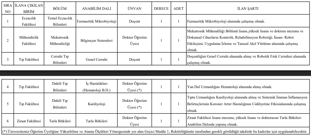 Düzce Üniversitesi bünyesinde açılan öğretim üyesi kadrolarından bazıları şunlar: