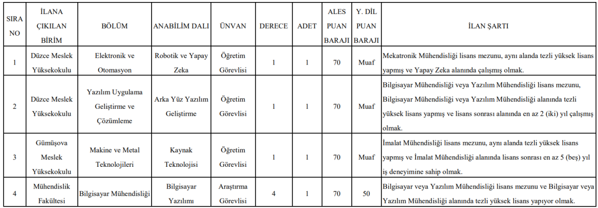 Düzce Meslek Yüksekokulu – Robotik ve Yapay Zeka (Öğr. Gör.): Mekatronik Mühendisliği lisans ve yüksek lisans mezunu olmak, yapay zeka alanında çalışmış olmak.