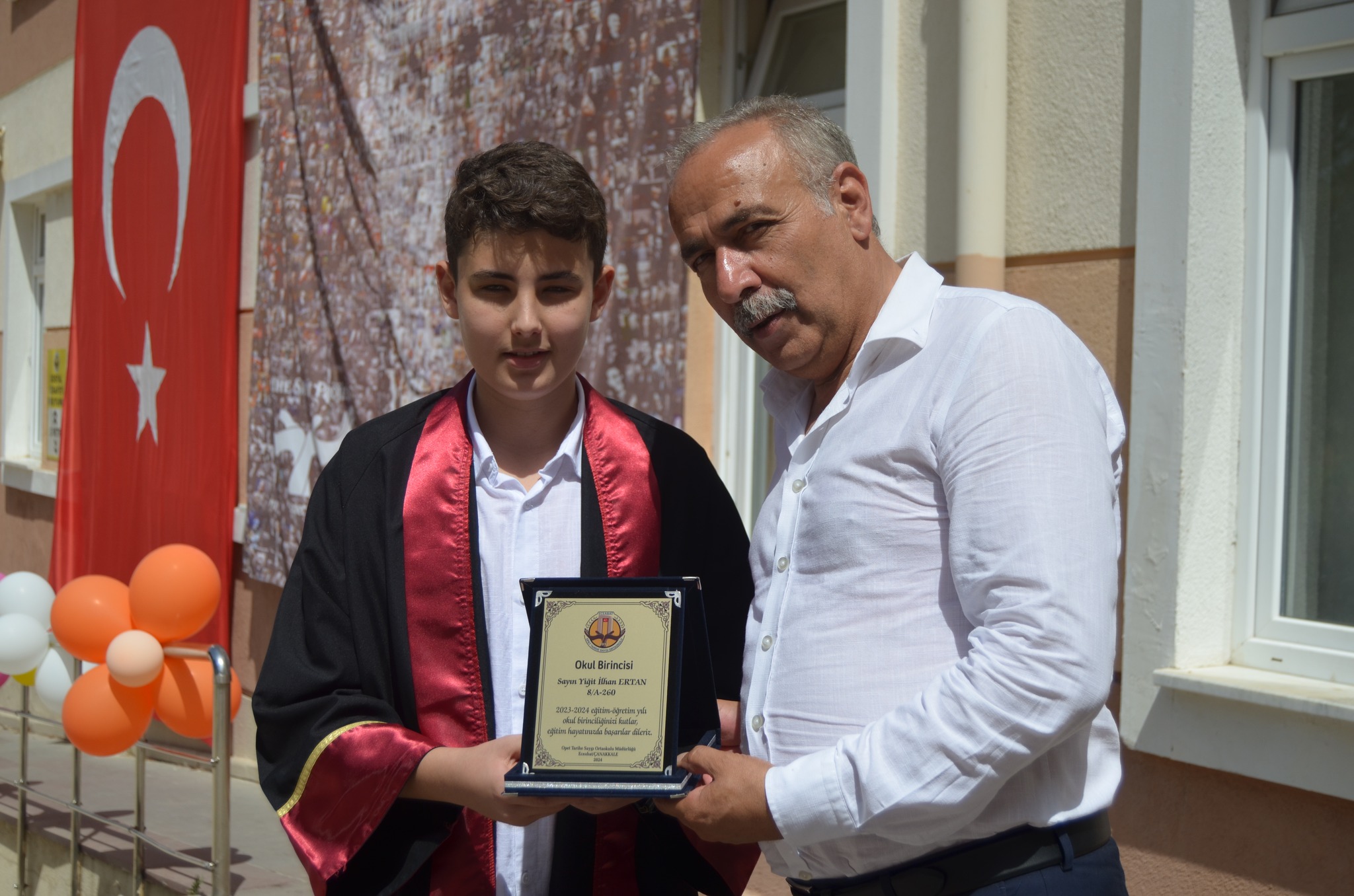 Eceabat Belediye Başkanı Saim Zileli, okul birincisi olan Yiğit İlhan Ertan’a plaketini takdim ederek tebriklerini iletti.
