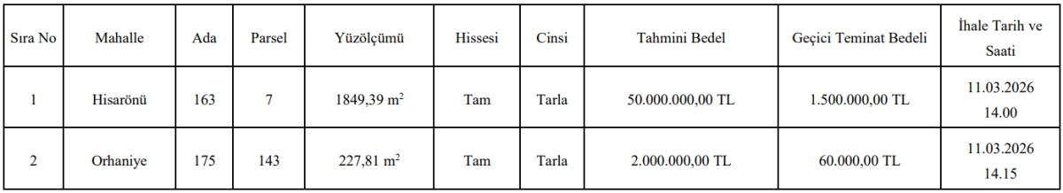İhalenin ilk sırasında Hisarönü Mahallesi’nde bulunan 163 ada 7 parsel yer alıyor. Toplam 1.849,39 metrekare yüzölçümüne sahip taşınmazın tamamı belediye mülkiyetinde bulunuyor. Tarla niteliğindeki taşınmaz için belirlenen tahmini bedel 50 milyon TL olarak açıklandı.