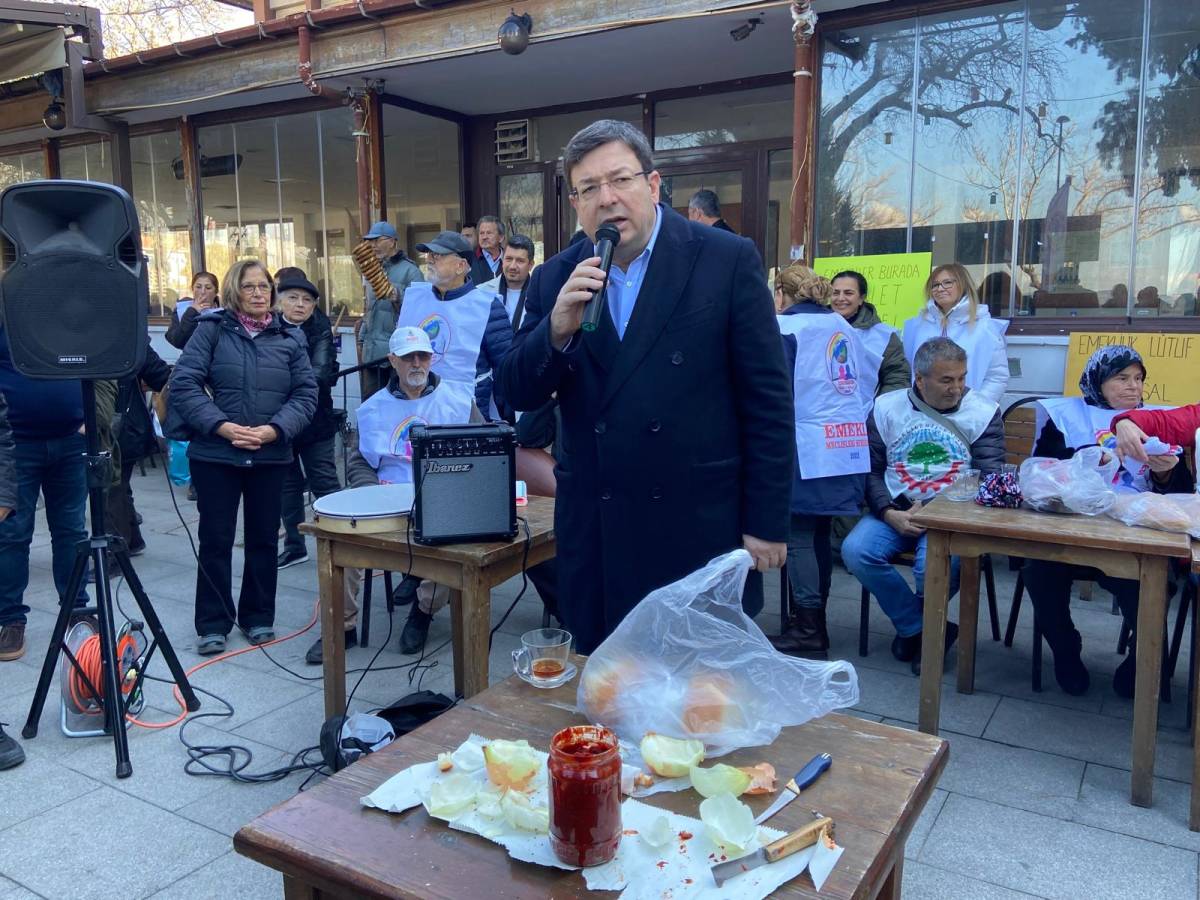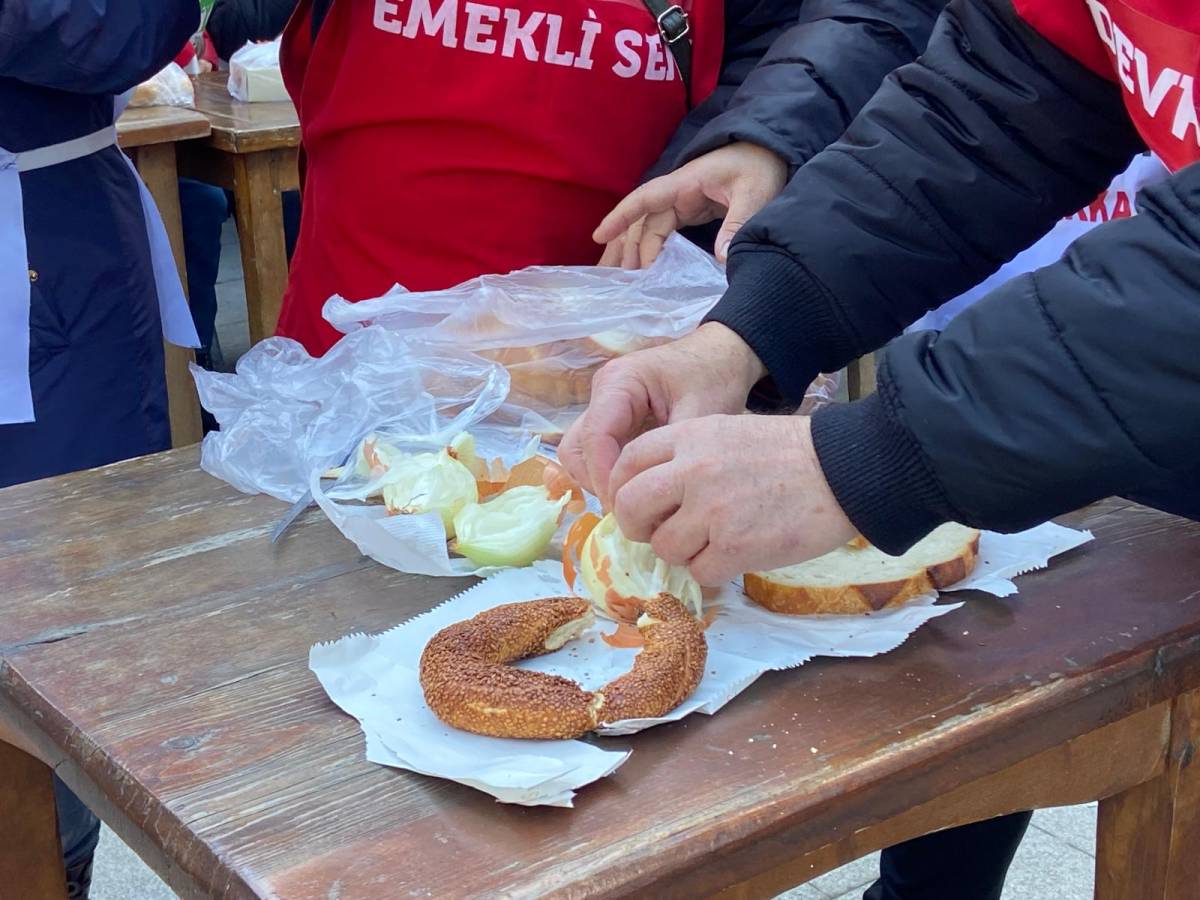 Basın açıklamasının ardından Türkan Saylan Sosyal Tesisleri’nde kurulan "yoksulluk sofrası" eylemin en çarpıcı anlarına sahne oldu. Lüks bütçelere ve milyarlık vergi aflarına tepki gösteren emekliler, yanlarında getirdikleri kuru soğanları yumruklarıyla kırarak ekmeklerini bölüştü.
