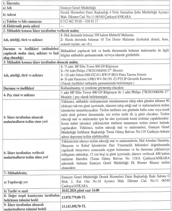 Mübadele işlemi, 10 Şubat 2026 Salı günü saat 14.00’te, Emniyet Genel Müdürlüğü Destek Hizmetleri Daire Başkanlığı İhale Salonu’nda yapılacak.