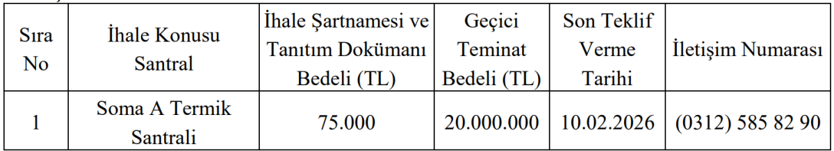 Soma A Termik Santrali ihalesi için ihale şartnamesi ve tanıtım dokümanı bedeli 75 bin TL olarak belirlendi. İhaleye katılmak isteyen yatırımcıların ayrıca 20 milyon TL tutarında geçici teminat yatırmaları gerekiyor.