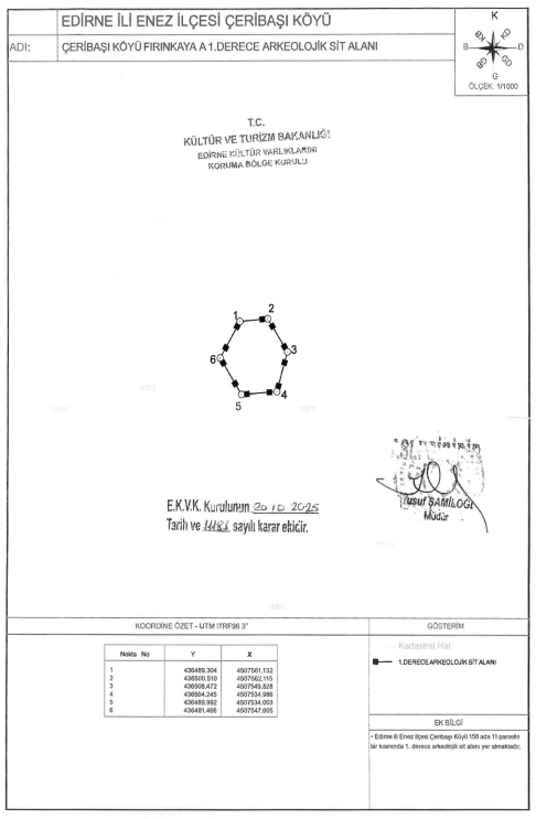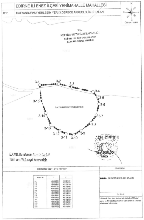 Kurulun 28.10.2025 tarihli kararında Edirne’nin Enez ilçesi Yenimahalle Mahallesi sınırlarında kalan Dalyanburnu Yerleşim Yerine ilişkin tescil işlemleri tamamlandı. Maliye Hazinesi mülkiyetinde bulunan 110 ada 89 parsel ile 626 ada 1 parselin bir kısmını kapsayan bölge, hazırlanan tescil fişleri doğrultusunda 3. derece arkeolojik sit alanı olarak kaydedildi.