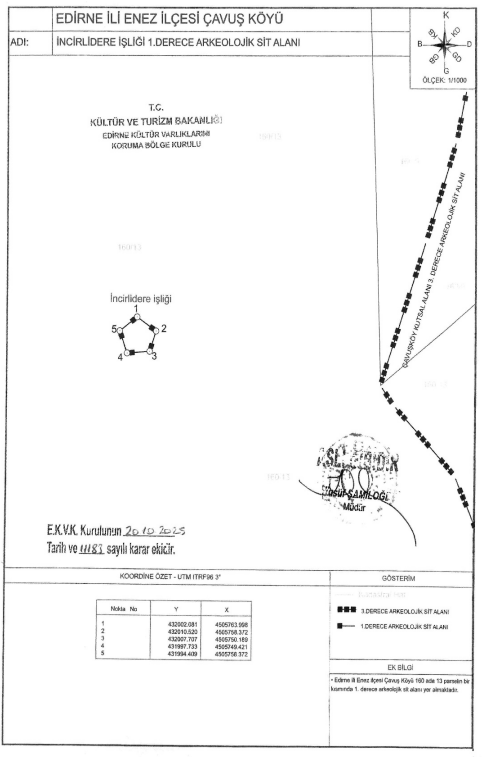 Çavuş köyü 160 ada 13 parseldeki İncirlidere İşliği, koordinatlı sınırlarıyla 1. derece arkeolojik sit alanı ilan edildi.