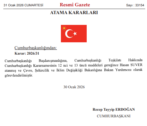 Resmî Gazete’nin 31 Ocak 2026 Cumartesi tarihli ve 33154 sayılı nüshasında yayımlanan “Atama Kararları” bölümünde yer alan düzenlemeye göre, Hasan Suver’in görevlendirilmesi Cumhurbaşkanlığı Kararı 2026/31 numarasıyla resmiyet kazandı. Karar metninde, Cumhurbaşkanlığı Başdanışmanlığına atanan Suver’in aynı zamanda Çevre, Şehircilik ve İklim Değişikliği Bakan Yardımcısı olarak görevlendirildiği açıkça belirtildi. Böylece Suver, hem Cumhurbaşkanlığı makamına doğrudan bağlı bir görev üstlenmiş oldu hem de bakanlık düzeyinde icrai sorumluluk taşıyan bir pozisyona getirildi.