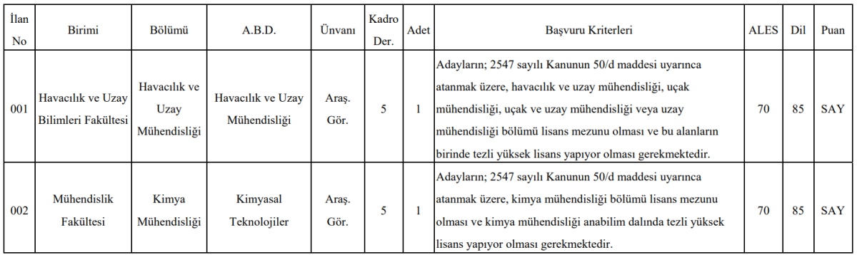 Eskişehir Teknik Üniversitesi (ESTÜ), 17 Ekim 2025 tarihli Resmî Gazete’de yayımlanan ilanla iki fakültesinde görev yapacak araştırma görevlisi alımı yapacağını duyurdu. Üniversite, Havacılık ve Uzay Bilimleri Fakültesi ile Mühendislik Fakültesi bünyesine toplam iki araştırma görevlisi istihdam edecek.