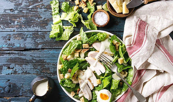 Salatanın Birleştirilmesi: Büyük bir salata kasesinde marul, kruton, tavuk dilimleri ve rendelenmiş parmesan peynirini karıştırın. Hazırladığınız sosu üzerine dökün ve iyice harmanlayın.