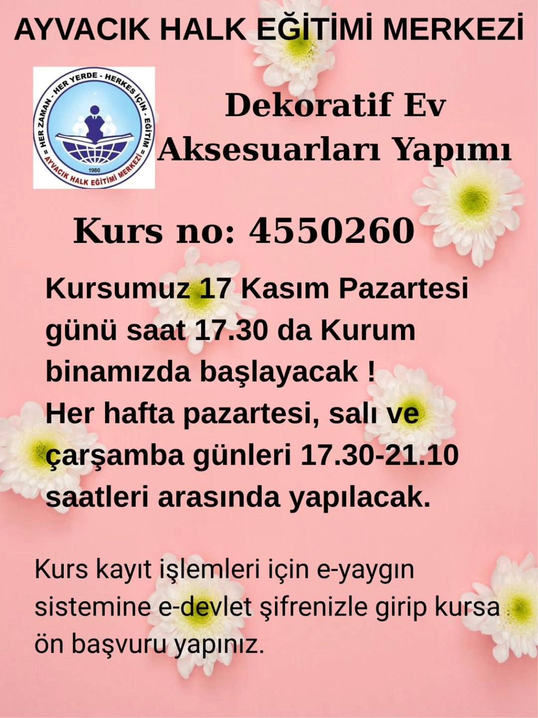 Ayvacık Halk Eğitimi Merkezi, el sanatlarına ilgi duyan vatandaşlara yönelik yeni bir kursun açılacağını duyurdu. “Dekoratif Ev Aksesuarları Yapımı” adıyla açılacak kurs, katılımcılara ev ve yaşam alanlarını süslemeye yönelik farklı tasarım ürünlerinin yapımını öğretecek. Kursun amacı, kişisel gelişimi desteklemek, el becerilerini geliştirmek ve üretici bireylerin sosyal hayata katılımını artırmak olarak belirtiliyor.