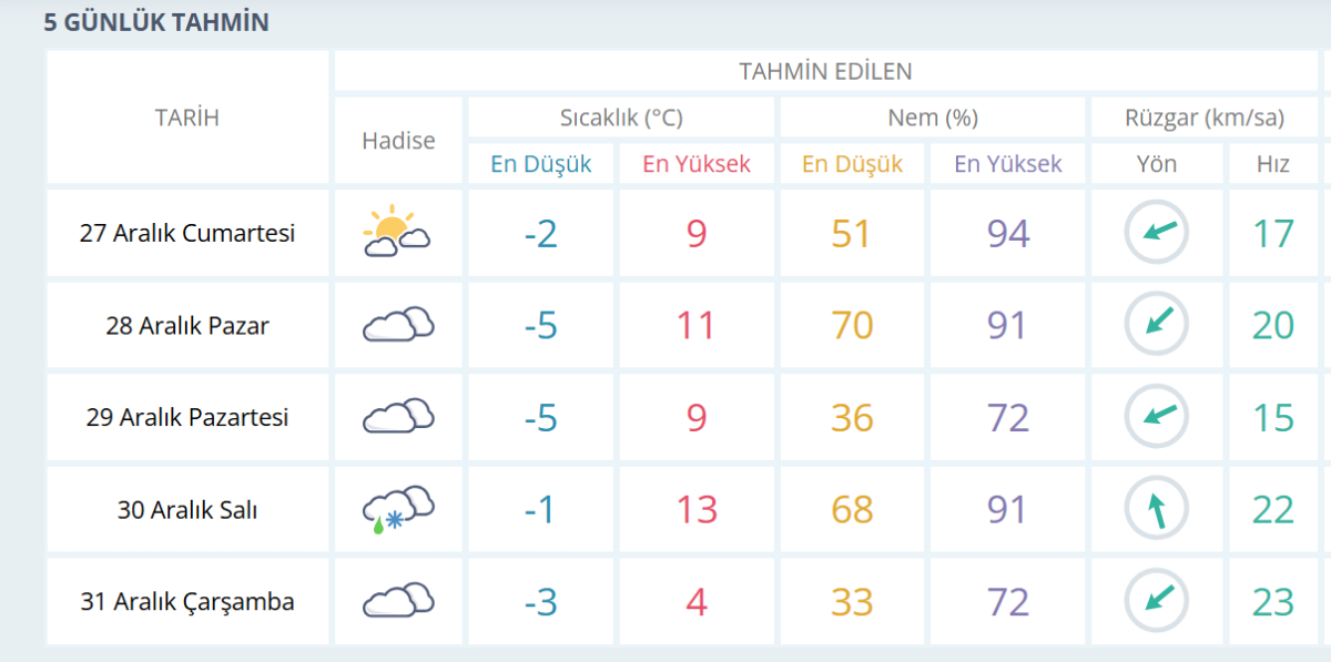 Salı günü (30 Aralık) bölgede karla karışık yağmur ve yüksek kesimlerde kar yağışı bekleniyor. Yağışla birlikte nem oranının %91’e çıkması, soğuğun etkisini daha da artıracak.