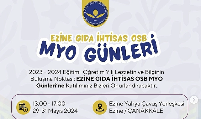 13:00’da saygı duruşu ve istiklal marşı ile başlayacak olan etkinliklerde Ezine Meslek Yüksekokul Müdür Dr. Öğr.Üyesi Mustafa Ekici, Ezine Gıda OSB Müdürü Alper Altınok, Ezine Belediye Başkanı Güray Yüksel, ÇOMÜ Rektörü Prof. Dr. R. Cüneyt Erenoğlu ve Ezine Kaymakamı Yunus Kızılgüneş tarafından açılış konuşmaları gerçekleştirilecek.