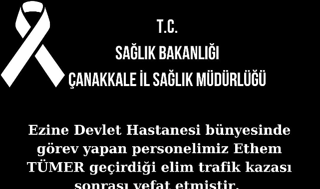 Çanakkale İl Sağlık Müdürlüğü, Ezine Devlet Hastanesi bünyesinde görev yapan personel Ethem Tümer'in geçirdiği trafik kazası sonucu vefat ettiğini duyurdu. Merhum Ethem Tümer’e Allah'tan rahmet, ailesine, sevenlerine ve sağlık camiasına başsağlığı dilekleri iletildi.