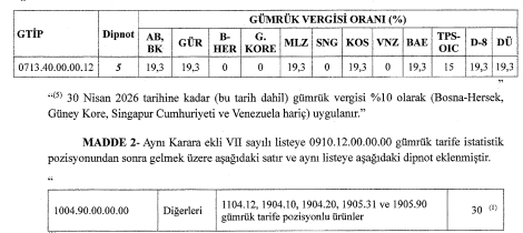 Kararın birinci maddesi ile 31 Aralık 2020 tarihli 3350 sayılı Cumhurbaşkanı Kararı ile yürürlüğe giren İthalat Rejimi Kararı’nın ekinde yer alan I sayılı listedeki “7. Fasıl” tablosunda bulunan 0713.40.00.00.12 GTİP numaralı eşya için uygulanan gümrük vergisi satırı yeniden düzenlendi.