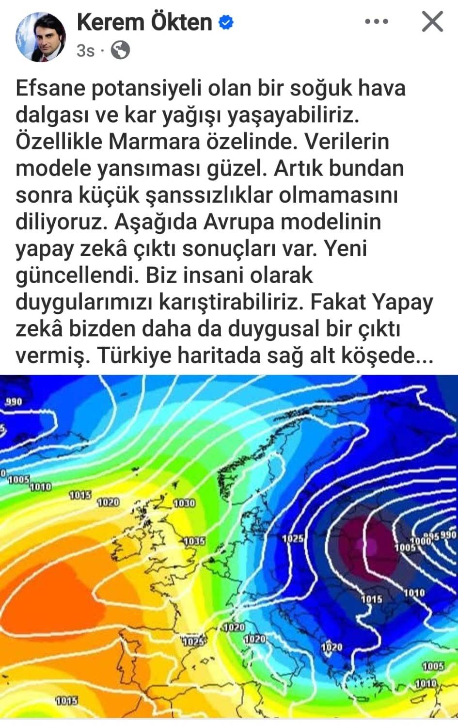 Son günlerde Türkiye’nin dört bir yanında yaşanan sel baskınları hâlâ hafızalardaki tazeliğini korurken, yeni paylaşılan meteorolojik tahminler tehlikenin henüz geçmediğini gösteriyor. Meteoroloji alanında uzun süredir takip edilen isimlerden Kerem Ökten, özellikle Marmara Bölgesi için “efsane potansiyeli olan” bir soğuk hava dalgasına dikkat çekti. Paylaşılan Avrupa merkezli model çıktılarında, sistemin Türkiye’ye güçlü biçimde yöneldiği görülüyor. Ökten’in vurgusu net: Veriler modele güzel yansıyor, artık küçük şanssızlıklar yaşanmaması tek temenni.