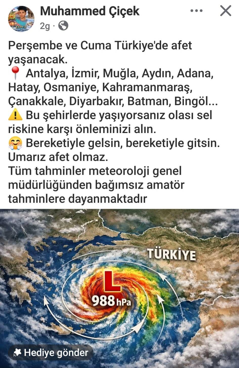 Öte yandan sosyal medyada geniş kitlelere ulaşan bir diğer paylaşım da endişeyi büyüttü. Muhammed Çiçek, Perşembe ve Cuma günleri için çok sayıda ilde “afet yaşanabileceği” uyarısında bulundu. Antalya’dan İzmir’e, Adana’dan Diyarbakır’a kadar uzanan geniş bir coğrafya işaret edilirken, özellikle ani ve kuvvetli yağışlara bağlı sel riskine karşı vatandaşların tedbir alması istendi.