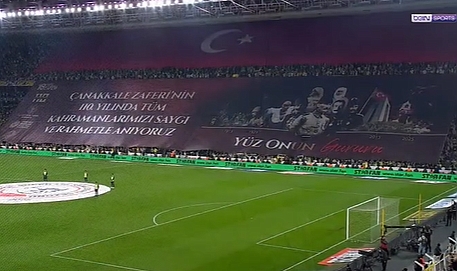 Ülker Stadyumu’nda mücadele öncesinde tribünlerde görkemli bir koreografi sergilendi. Taraftarlar, dev Türk bayrağı eşliğinde Gazi Mustafa Kemal Atatürk ve Çanakkale kahramanlarının görsellerinin yer aldığı dev bir pankart açarak zaferin ruhunu yaşattı. Stadyumdaki ışık gösterileriyle görsel şölen zirveye çıkarken, taraftarların coşkusu tribünleri adeta inletti.
