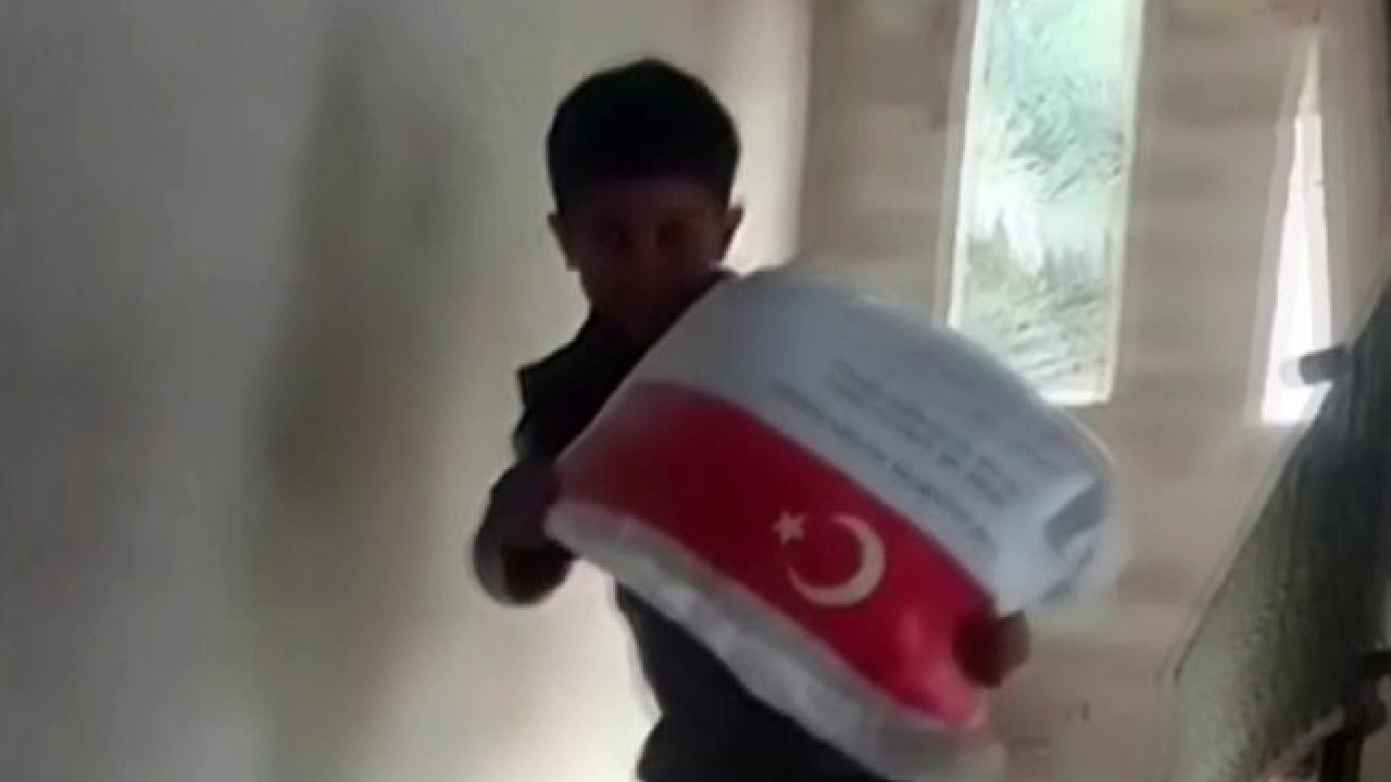 Gazze Şeridi’nde Filistinli çocuğun Türkiye’den gelen yardımlarda kendi ağırlığı kadar un çuvalını taşıdığı görüntüler dikkat çekti.
