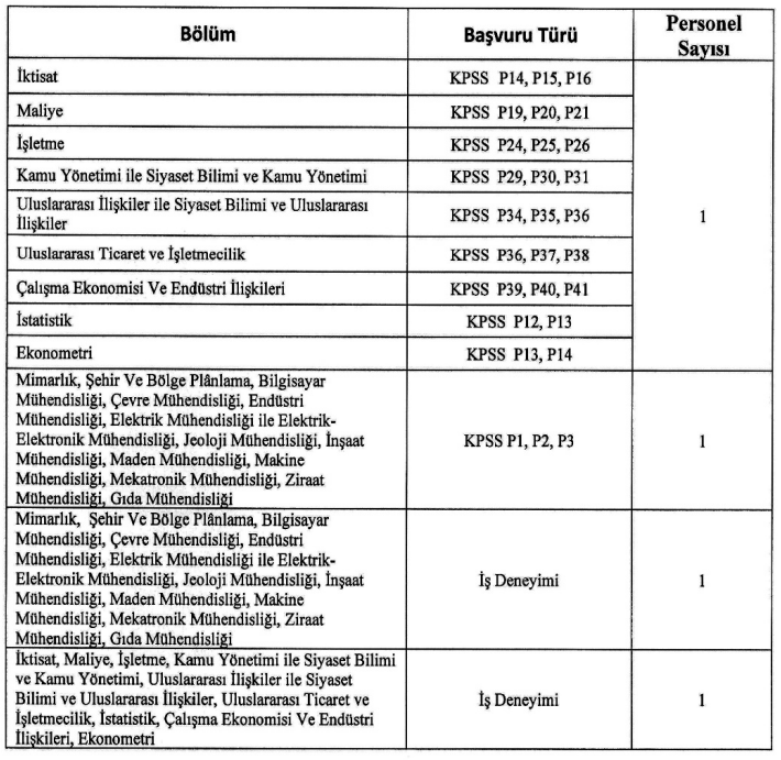 Uzman personel kadrolarına başvuracak adayların en az dört yıllık lisans mezunu olması gerekiyor. İktisat, işletme, maliye, kamu yönetimi, uluslararası ilişkiler, mühendislik alanları ve benzeri bölümler başvuru yapılabilecek alanlar arasında yer alıyor.