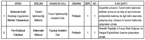 Turizm İşletmeciliği: Giresun ili turizmi üzerine çalışmaları olan, Turizm bilim alanında doçentliğini almış ve en az 5 yıl ilgili bilim alanında çalışmış olmak.