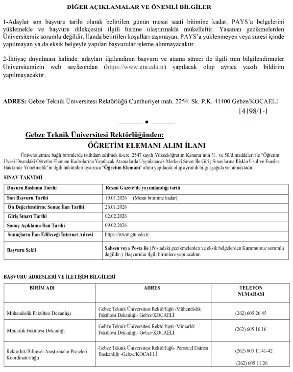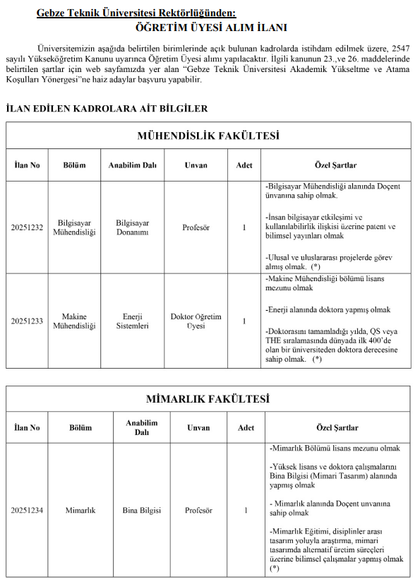 Gebze Teknik Üniversitesi (GTÜ) Rektörlüğü, akademik kadrosunu güçlendirmek amacıyla öğretim üyesi ve öğretim elemanı alımına ilişkin iki ayrı resmi ilan yayımladı. 2547 sayılı Yükseköğretim Kanunu kapsamında gerçekleştirilecek alımlar, üniversitenin Mühendislik Fakültesi, Mimarlık Fakültesi, Yer ve Deniz Bilimleri Enstitüsü ile Rektörlüğe bağlı birimlerde yapılacak.
