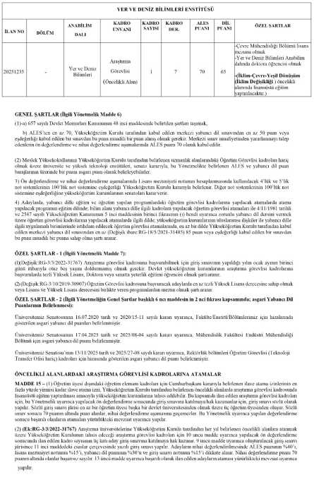 Özel Şart: Çevre Mühendisliği mezunu olmak ve ilgili anabilim dalında doktora öğrencisi olmak