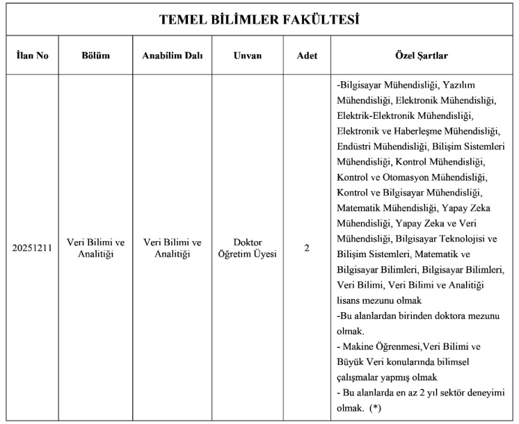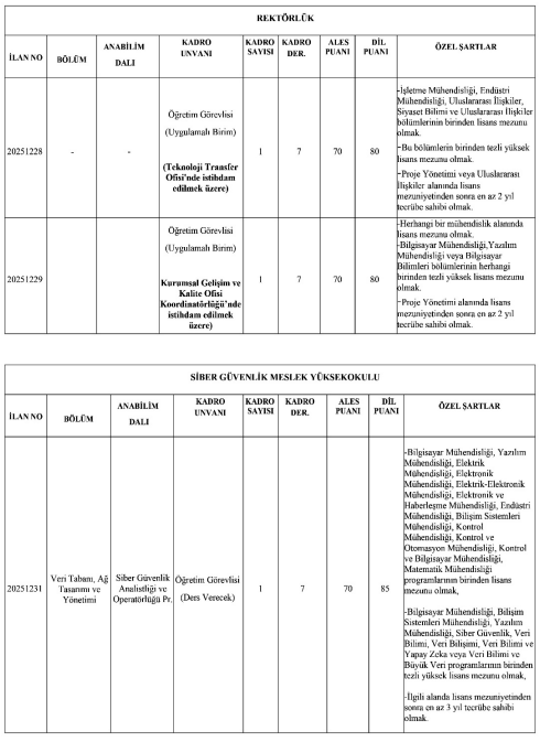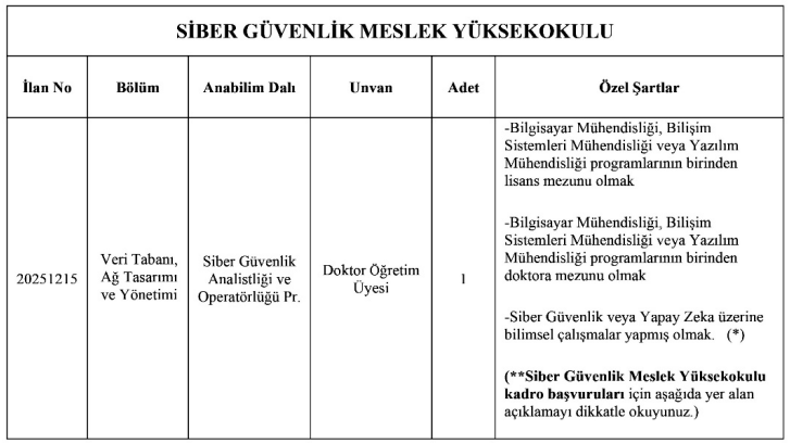 Öte yandan, Siber Güvenlik Meslek Yüksekokulu Doktor Öğretim Üyesi kadroları için bazı özel düzenlemeler bulunuyor. Bu kadrolara başvuran adaylar için, ilan metninde belirtilen bazı sınırlamaların uygulanmayacağı özellikle belirtildi.