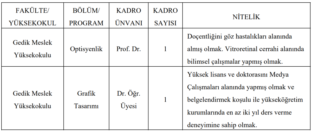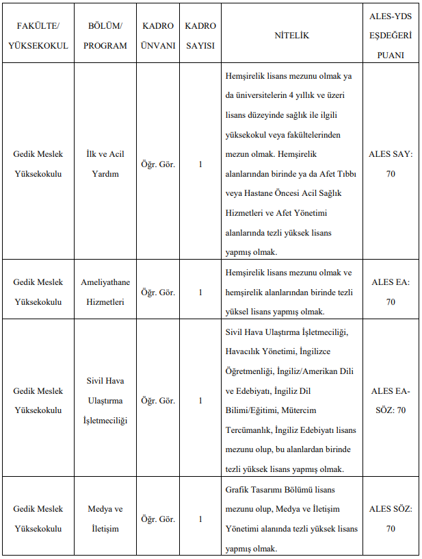 Bunun yanı sıra İlk ve Acil Yardım, Ameliyathane Hizmetleri, Sivil Hava Ulaştırma İşletmeciliği ve Medya ve İletişim bölümleri için öğretim görevlisi alımı da yapılacak.