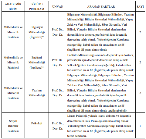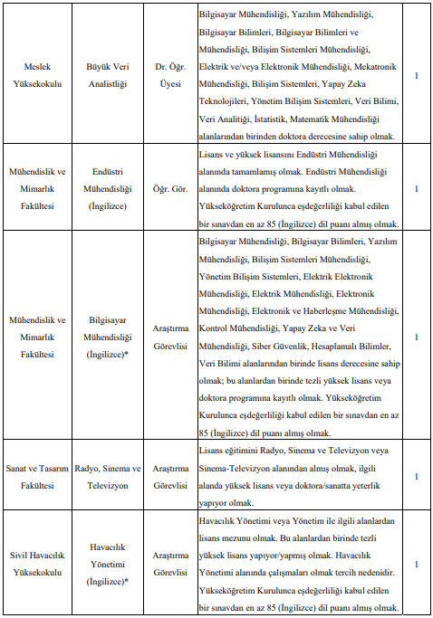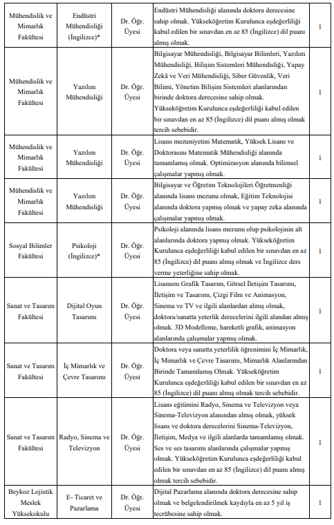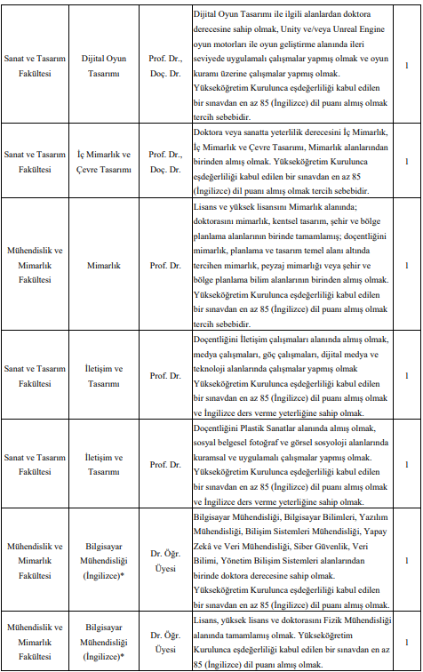 İlan kapsamında profesör ve doçent kadroları için özellikle mühendislik, bilişim, psikoloji, mimarlık ve tasarım alanlarında uzman akademisyenler aranıyor. Adaylardan, alanlarında doktora ve doçentlik derecesine sahip olmaları, bilimsel çalışmalar yapmış olmaları ve çoğu kadro için en az 85 YDS veya dengi yabancı dil puanı almaları bekleniyor.