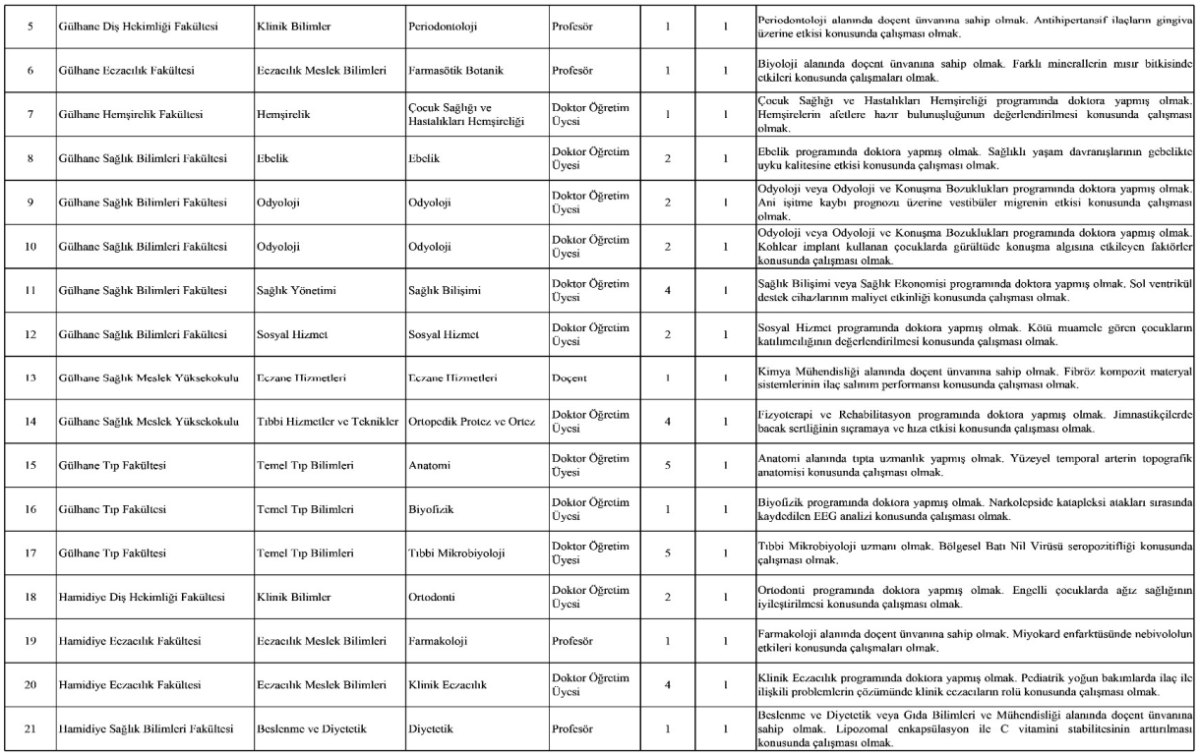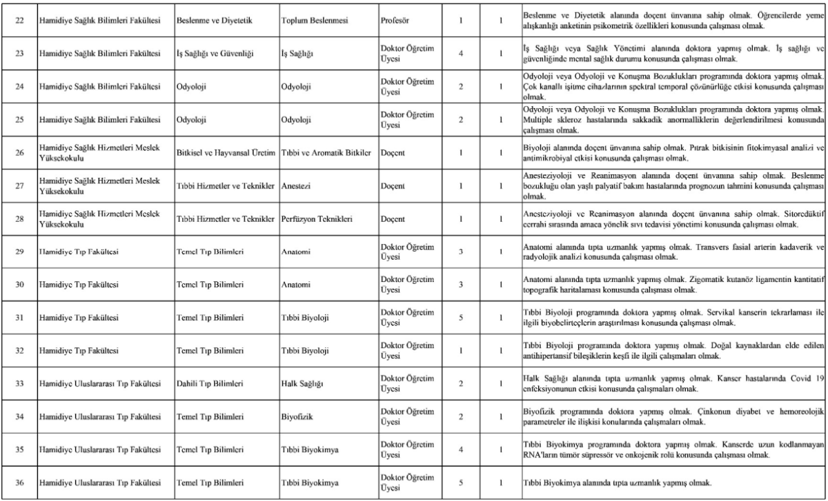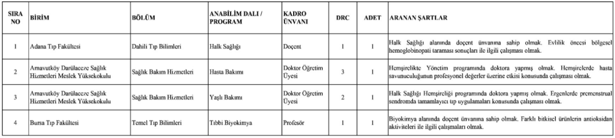 İlan kapsamında profesör ve doçent kadroları daimi statüde açıldı. Profesör kadrosuna başvuracak adayların, başvurularını Başlıca Araştırma Eseri ile birlikte ilanın yayımlandığı tarihten itibaren 15 gün içinde online olarak yapmaları gerekiyor. Doçent ve doktor öğretim üyesi kadroları için de aynı süre içerisinde elektronik başvuru şartı bulunuyor.