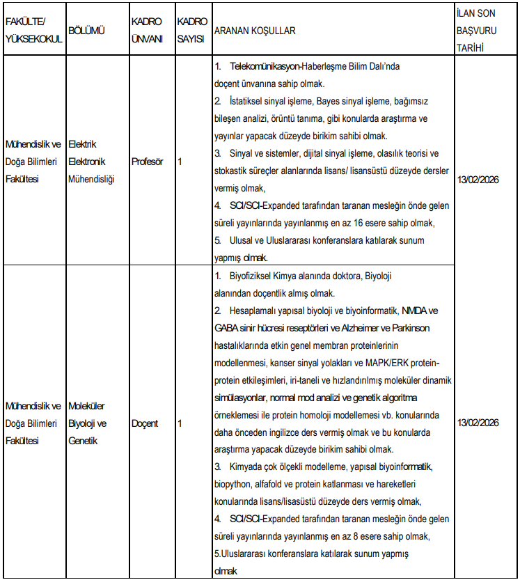 İlanda, hesaplamalı yapısal biyoloji ve biyoinformatik, Alzheimer ve Parkinson hastalıklarıyla ilişkili membran proteinlerinin modellenmesi, kanser sinyal yolakları ve protein-protein etkileşimleri gibi ileri düzey konularda hem araştırma yapabilecek hem de daha önce İngilizce ders vermiş akademisyenler tercih edilecek. Ayrıca çok ölçekli modelleme, yapısal biyoinformatik, biopython, AlphaFold ve protein katlanması konularında lisans ve lisansüstü düzeyde ders deneyimi de önemli kriterler arasında yer alıyor.