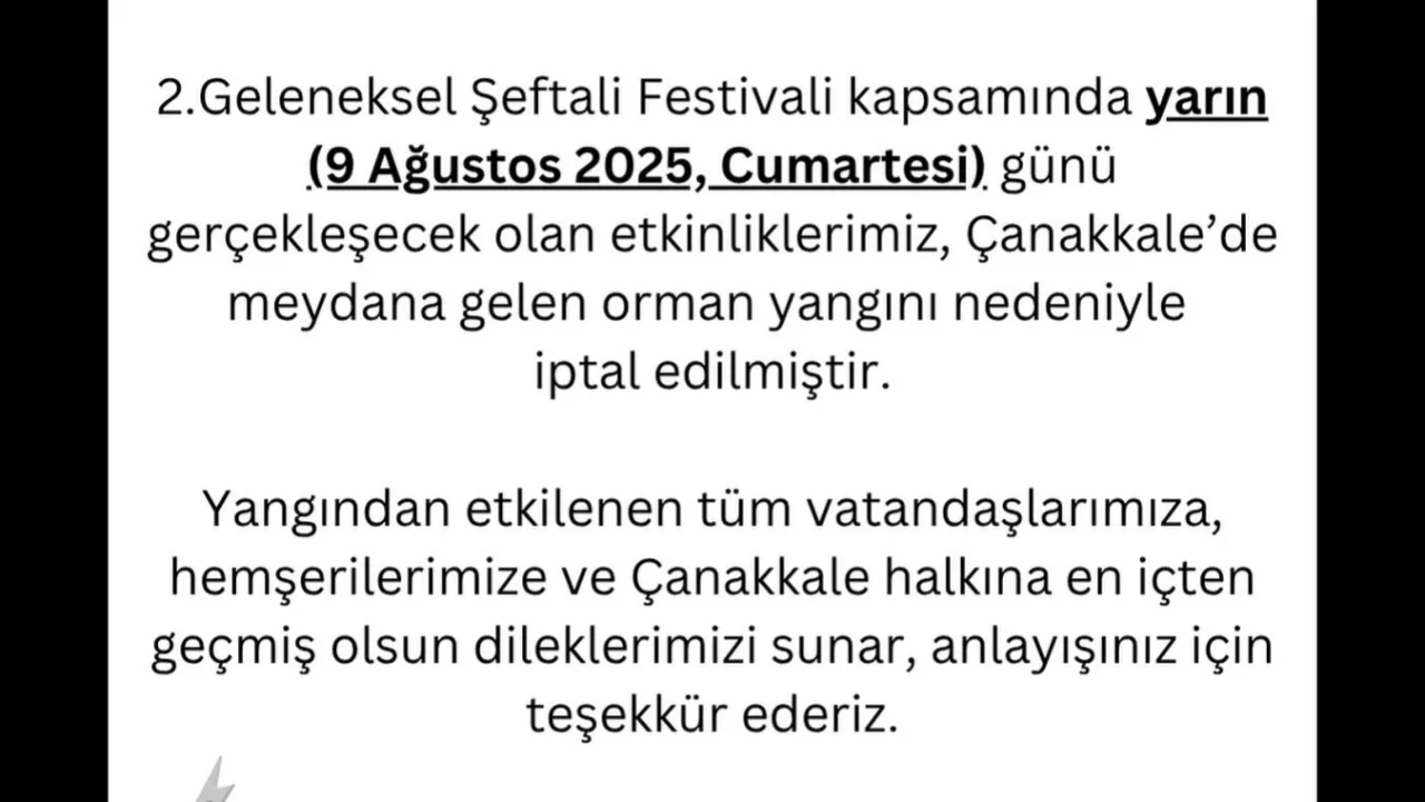 Lapseki Belediyesi, 9 Ağustos 2025 Cumartesi günü düzenlenmesi planlanan 2. Geleneksel Şeftali Festivali etkinliklerinin, Çanakkale’de meydana gelen orman yangını nedeniyle iptal edildiğini duyurdu.