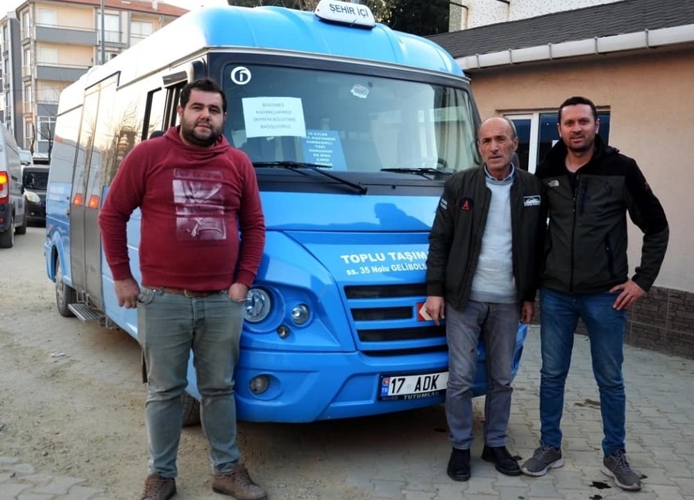 Çanakkale’nin Gelibolu ilçesindeki şehiriçi minibüsçüleri bir günlük çalışmalarından servislerinden elde edecekleri gelirin tamamını depremzedelere bağışladı.