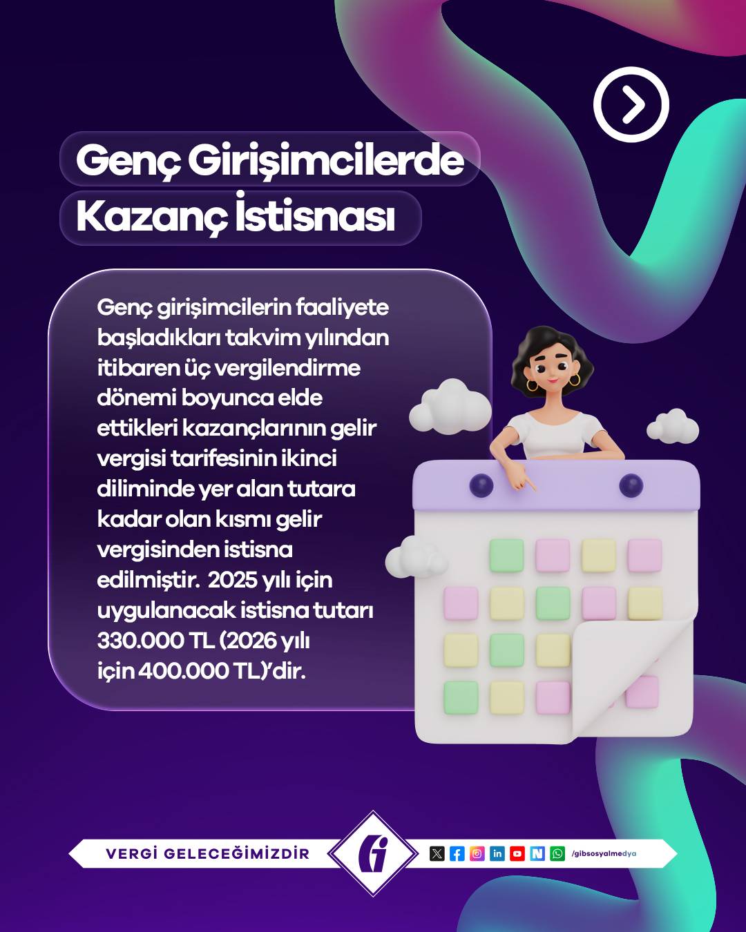 Genç girişimcilerin kazanç istisnası, faaliyete başladıkları takvim yılından itibaren üç vergilendirme dönemi boyunca uygulanıyor. Bu süre içerisinde elde edilen kazançların, gelir vergisi tarifesinin ikinci diliminde yer alan tutara kadar olan kısmı gelir vergisinden muaf tutuluyor.