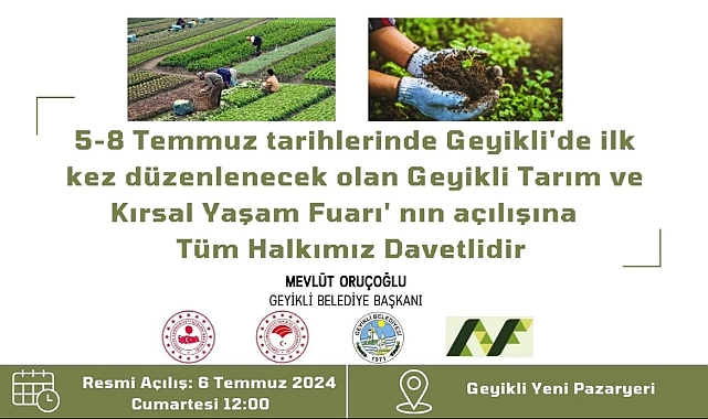 Geyikli, bu yıl 5-8 Temmuz tarihleri arasında düzenlenecek olan Tarım ve Kırsal Yaşam Fuarı'na ev sahipliği yapacak. Fuar, Geyikli Yeni Pazaryerinde gerçekleşecek ve resmi açılışı 6 Temmuz Cumartesi günü saat 12:00'de yapılacak.
