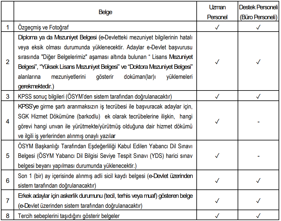 Her iki pozisyon için özgeçmiş, fotoğraf, diploma, adli sicil belgesi ve askerlik durum belgesi (erkek adaylar için) başvuru sırasında sisteme yükleniyor. Uzman personel için ek olarak YDS/eşdeğer dil belgesi ve tecrübe ile ilgili SGK dökümleri isteniyor.