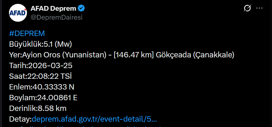 Afet ve Acil Durum Yönetimi Başkanlığı (AFAD), Ege Denizi'nde merkez üssü Yunanistan'ın Ayion Oros (Aynoroz) bölgesi olan orta şiddette bir depremin meydana geldiğini bildirdi. 25 Mart 2026 Çarşamba günü saat 22:08'de kaydedilen depremin büyüklüğü 5.1 (Mw) olarak ölçüldü.