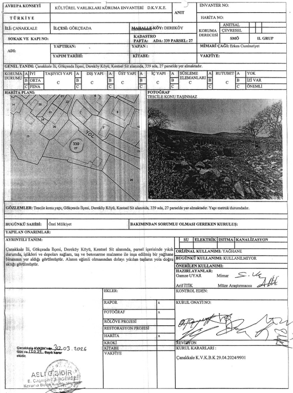 Çanakkale’de tarihi mirası yakından ilgilendiren önemli bir karar alındı. Çanakkale Kültür Varlıklarını Koruma Bölge Kurulu, Gökçeada’nın Dereköy Köyü’nde bulunan ve yıkılma tehlikesiyle karşı karşıya olan bir yapıyı koruma altına aldı.