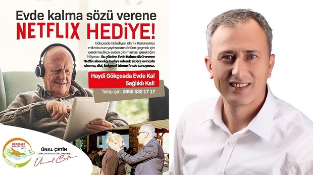 İçişleri Bakanlığınca 65 yaşüstü vatandaşların evden çıkmamaları için yasak getirildi. Gökçeada Belediye Başkanı Ünal Çetin, yaşlıları evde tutmak için ilginç bir çözüm buldu. İYİ Partili Ünal Çetin, Gökçeada'da yaşayan 65 yaşüstü vatandaşların evden çıkmadan vakit geçirmelerini sağlamak üzere Netflix aboneliği taahhüt etti. Ünal Çetin yayınladığı mesajında; "Gökçeada Belediyesi olarak Koronavirüs mikrobunun yayılmasının önüne geçilmesi için gerekmedikçe evden çıkılmaması gerektiğini biliyoruz. Bu yüzden evde kalma sözü verene Netflix aboneliği hediye ederek sizlere evinizde sinema, dizi, belgesel izleme fırsatı sunuyoruz. Haydi Gökçeada'' ifadelerine yer verdi.