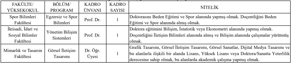 Yönetim Bilişim Sistemleri Bölümü için 1 Profesör Doktor alınacak. Bu kadro için; doktora eğitimini Bilişim, İstatistik veya Ekonometri alanında yapmış olmak, doçentliği ise İletişim Bilimleri alanında almış olmak ve bilişim alanında akademik çalışmalar yürütmüş olmak şartı aranıyor.