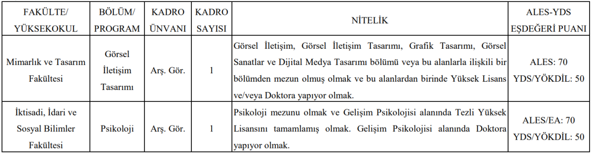 Mimarlık ve Tasarım Fakültesi Görsel İletişim Tasarımı Bölümü için 1 Araştırma Görevlisi alınacak. Adayların ilgili alanlardan mezun olmaları ve bu alanlarda yüksek lisans veya doktora yapıyor olmaları gerekiyor.