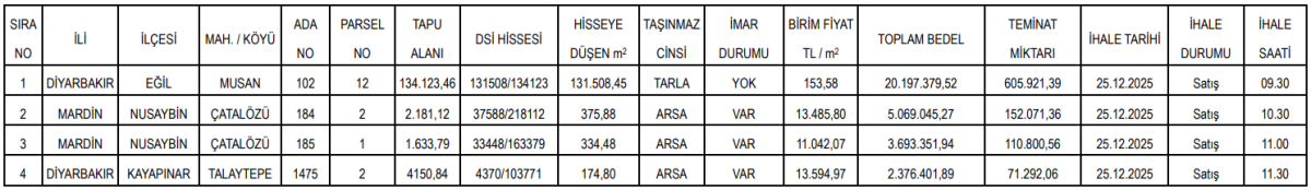 DSİ tarafından ilan edilen taşınmazların öne çıkan bilgileri şöyle: