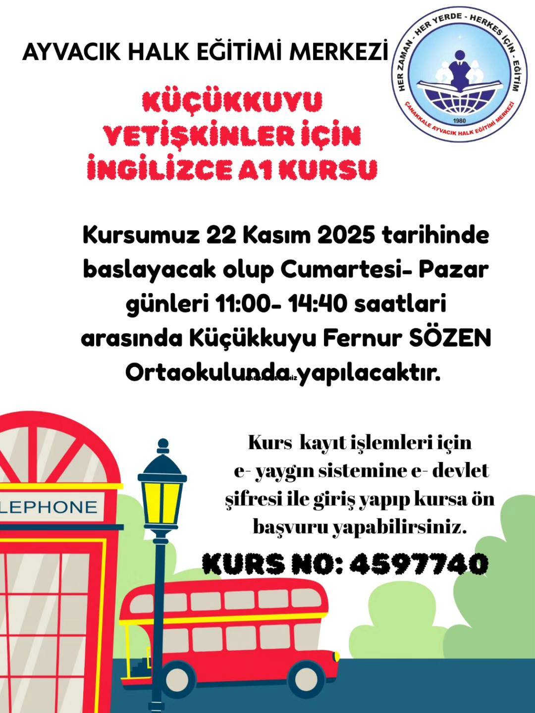 Ayvacık Küçükkuyu’da düzenlenecek olan İngilizce A1 kursuna tüm yetişkinler davetli. Kurs, eğitim ve kişisel gelişim alanında bölge halkına yeni bir olanak sunuyor.