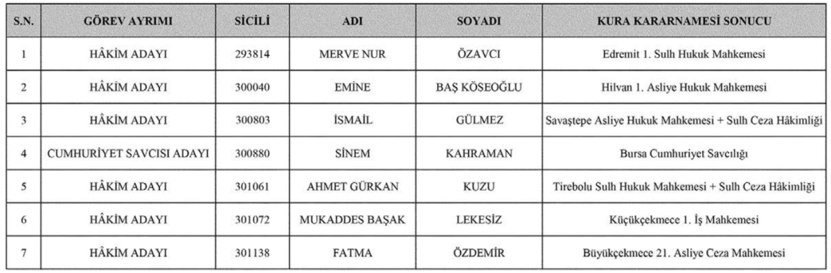 Kararnameye göre, adli yargı hâkim ve Cumhuriyet savcısı adayları ile idari yargı hâkim adaylarının kura sonucu atandıkları mahkemeler ve görev ayrımları kamuoyuyla paylaşıldı. Böylece yargı teşkilatında yeni dönemin görev dağılımı resmiyet kazandı.