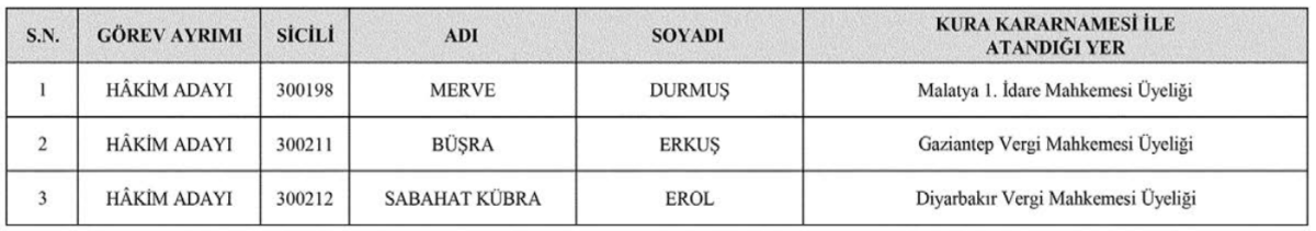 Bu kapsamda, Malatya 1. İdare Mahkemesi Üyeliği’ne Merve Durmuş atanırken, Gaziantep Vergi Mahkemesi Üyeliği görevine Büşra Erkus getirildi. Diyarbakır Vergi Mahkemesi Üyeliği ise Sabahattin Kübra Erol’a verildi.